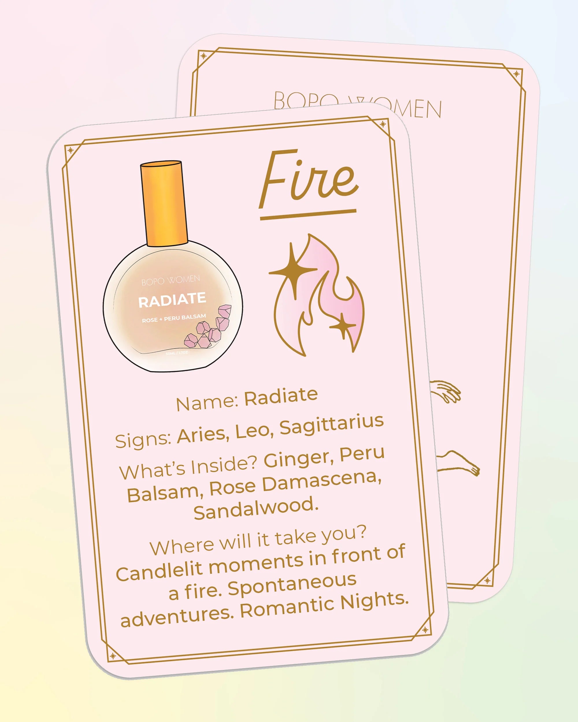 The Radiate Body Mist embodies the fire sign element and comes with a beautiful gold foil Fire Woman Tarot Card.